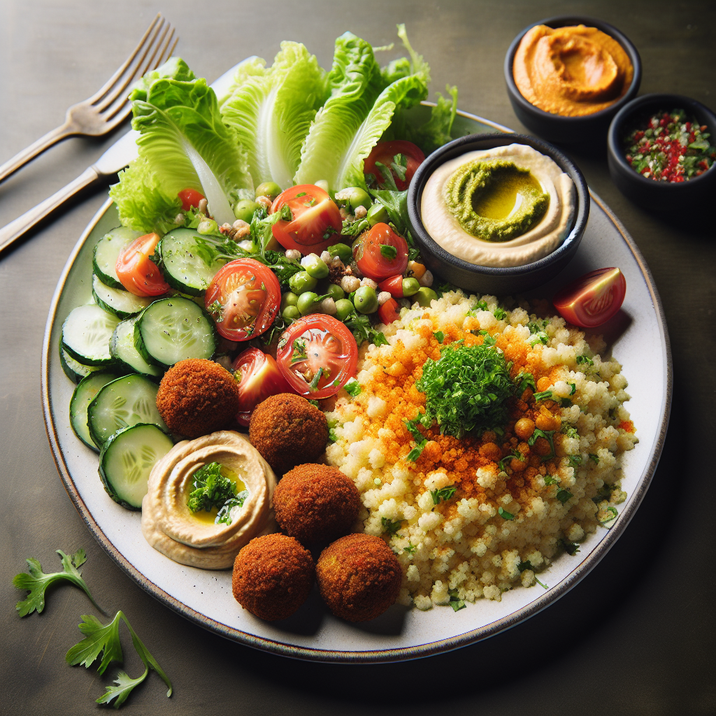 Kisir türkischer Couscous mit Falafel Hummus und frischen Romanasalat Blättern an der Seite